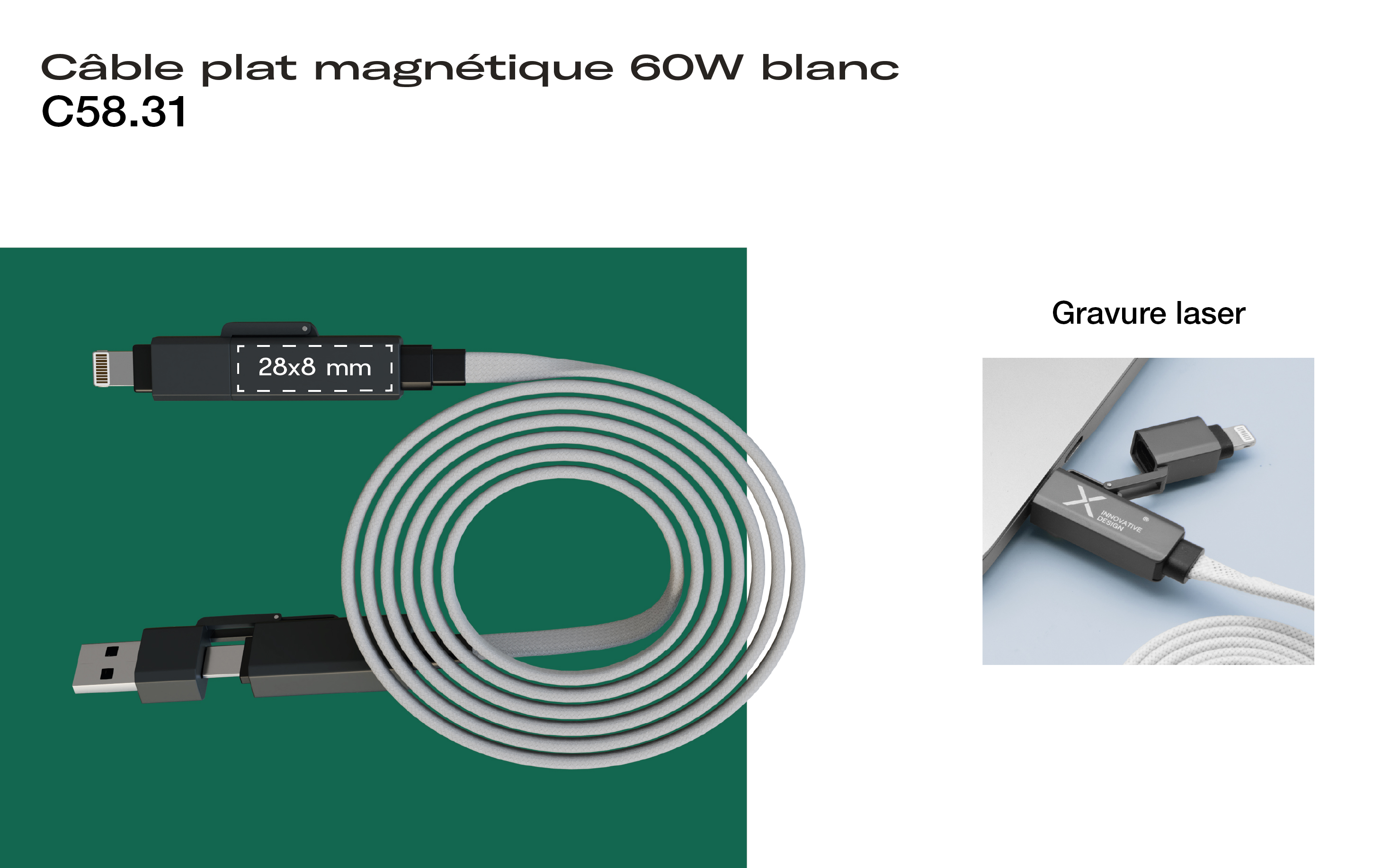 Ultra-fast 60W charging cable, flat and magnetic, 1 meter long. Capable of charging smartphones, tablets, and laptops. Compatible with Apple and Android CarPlay.