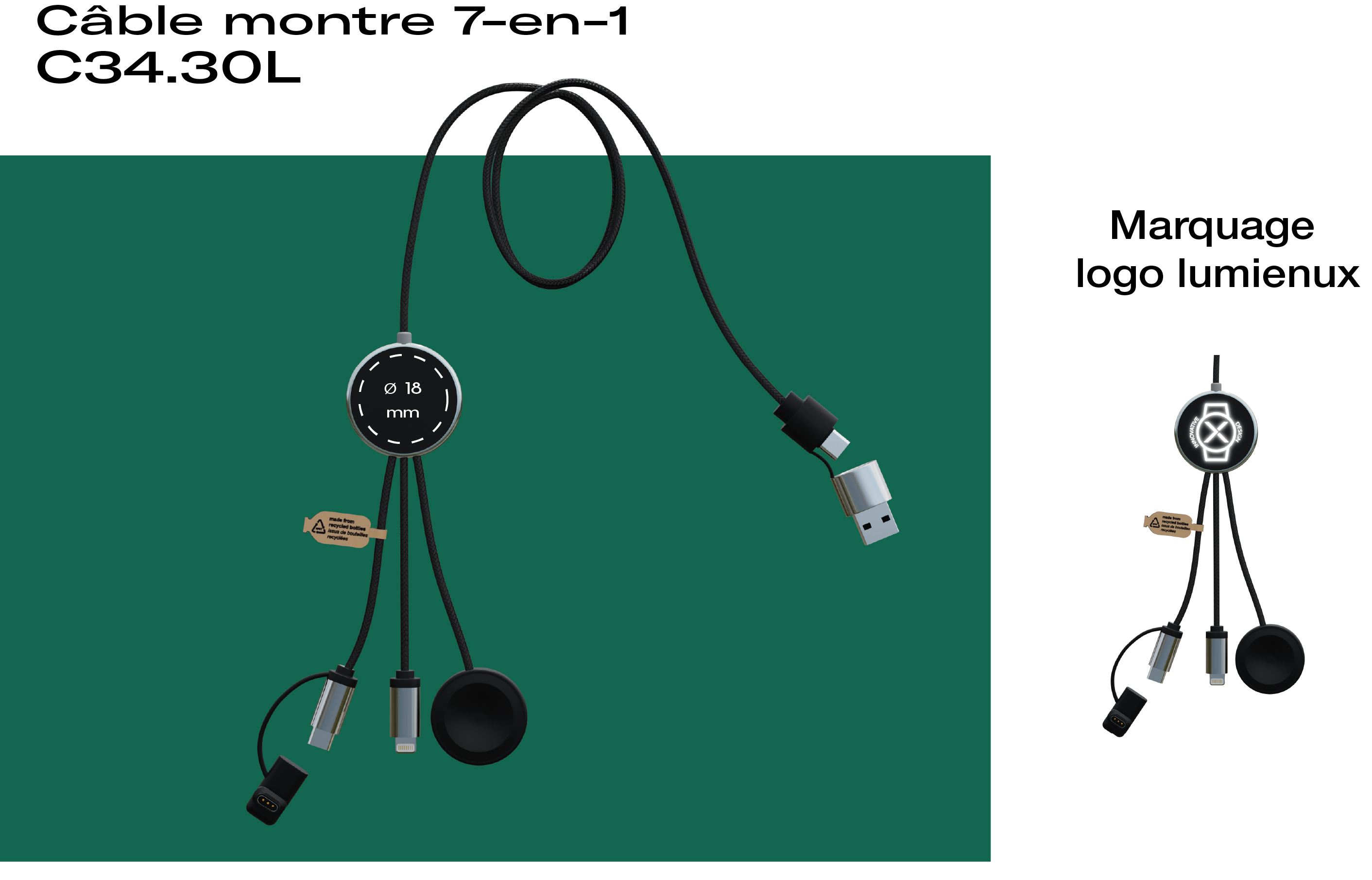 7-in-1 cable, equipped with 5 output connectors (Lightning, Type-C, Apple Watch, Samsung Watch, and Garmin connector) and specially designed for charging devices and smartwatches.