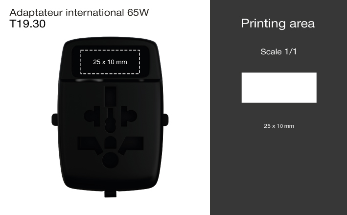 Universal travel adapter, featuring two USB-A ports and two USB-C ports, including one ultra-fast 65W USB-C GaN & Power Delivery port, enhanced with a luminous logo and rubber finish for a premium look and feel.