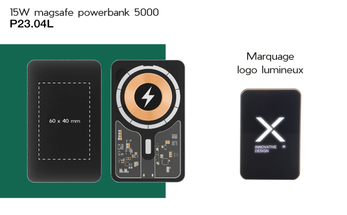 Batterie en aluminium recyclé d'une capacité de 5000 mAh, personnalisable par logo lumineux blanc ou quadri digital.
