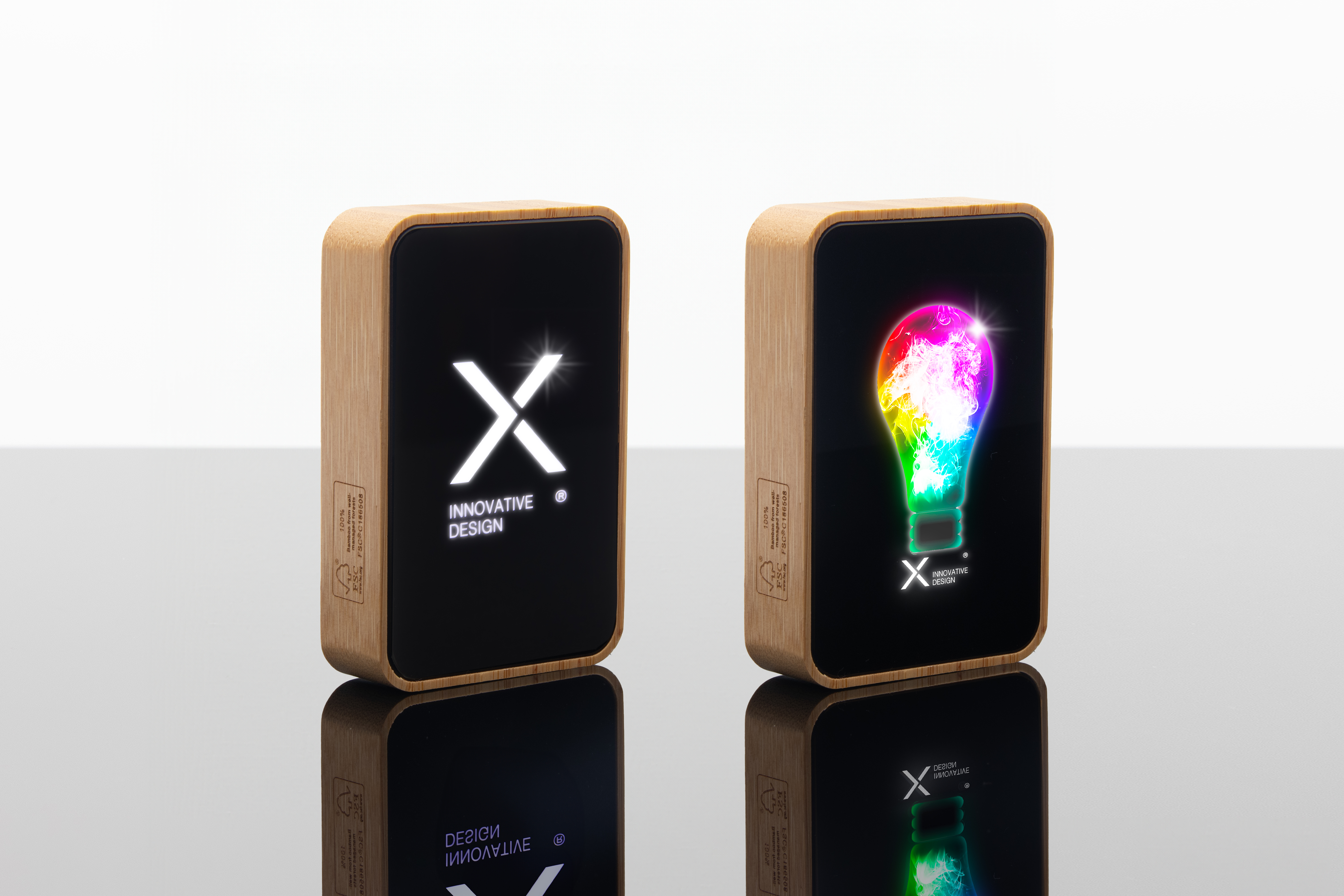 Éco-conçue en bois de bambou, cette batterie d’une capacité de 10 000 mAh peut être personnalisée avec un logo lumineux ou une impression digitale quadri.